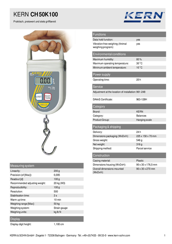 CH 50K100 Waga hakowa, wisząca Kern CH 50K100, Zakres pomiaru maks. 50 kg, Podziałka...