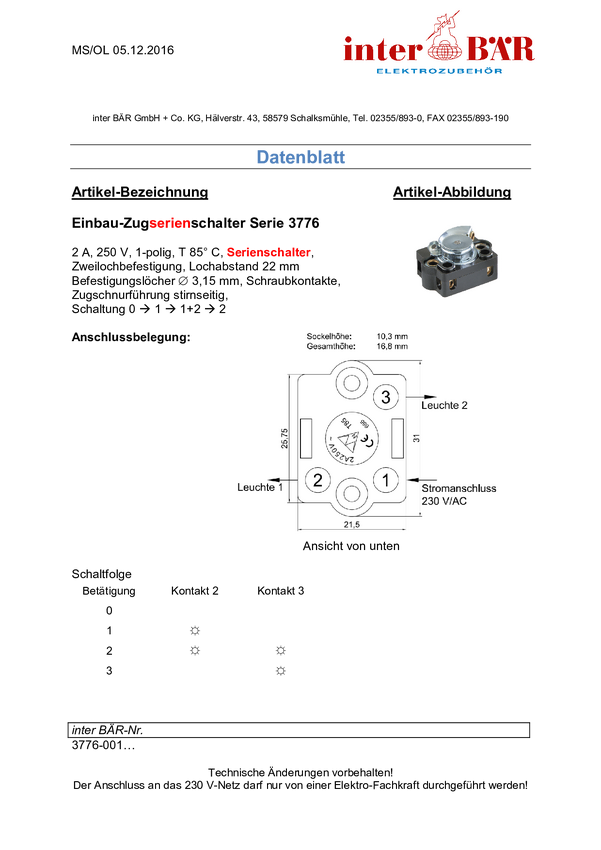 3776-001.82 interBär Przełącznik ciągnący SERII czarny 1 x wył/wł/wł/wł 2 A...