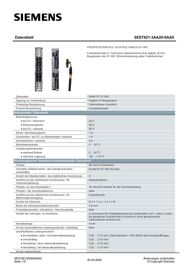 Siemens 6ES7921-3AA20-0AA0 6ES79213AA200AA0 Moduł przedni wtykowy PL 60 V