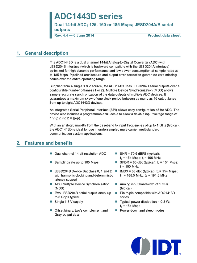 ADC1443D200HD-C1 Dual Channel 14-Bit ADC; 200Msps; JESD204B Serial Outputs