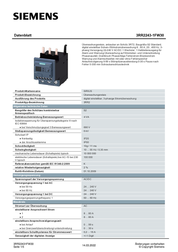 3RR22431FW30 Siemens 3RR22431FW30 Przekaźnik monitorujący 3RR2243-1FW30, 1 szt.