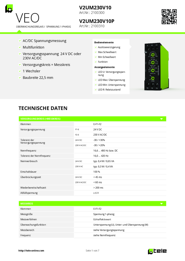 2100300 Przekaźnik monitorujący 1 zestyk przełączny tele V2UM230V10 1 szt.