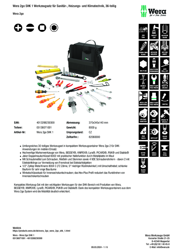 Wera 2go SHK 1 05136071001 dla instalatorów sanitarnych Torba narzędziowa z wyposażeniem 36 szt.