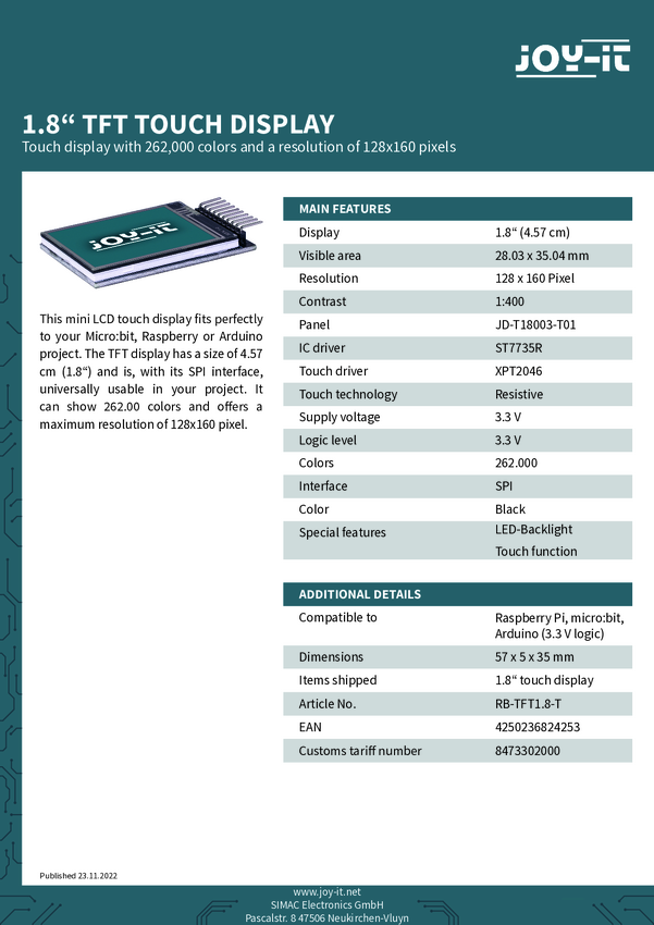 RB-TFT1.8-T Moduł ekranu dotykowego Joy-it RB-TFT1.8-T 4.6 cm (1.8 cal) 160 x 128 Pixel...
