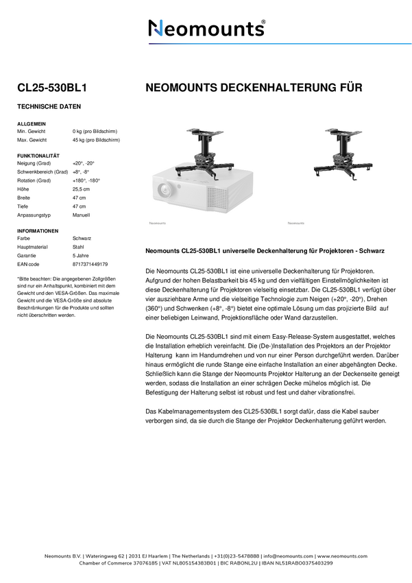 CL25-530BL1 Uchwyt sufitowy do projektora Neomounts CL25-530BL1, Uchwyt sufitowy, uchyl...