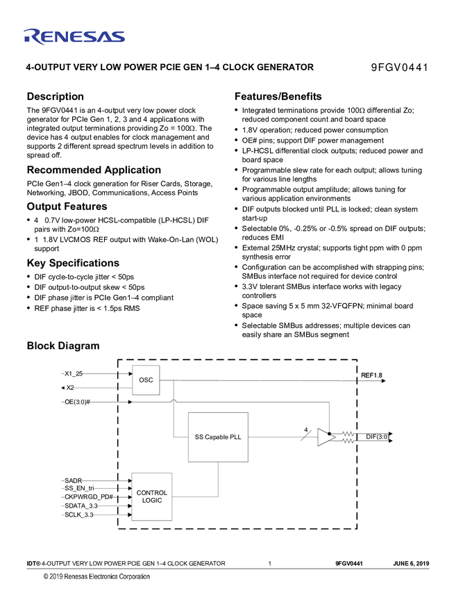 9FGV0441AKILF 4-Output 1.8V PCIe Gen 1-4 Clock Generator with Zo = 100 Ohms