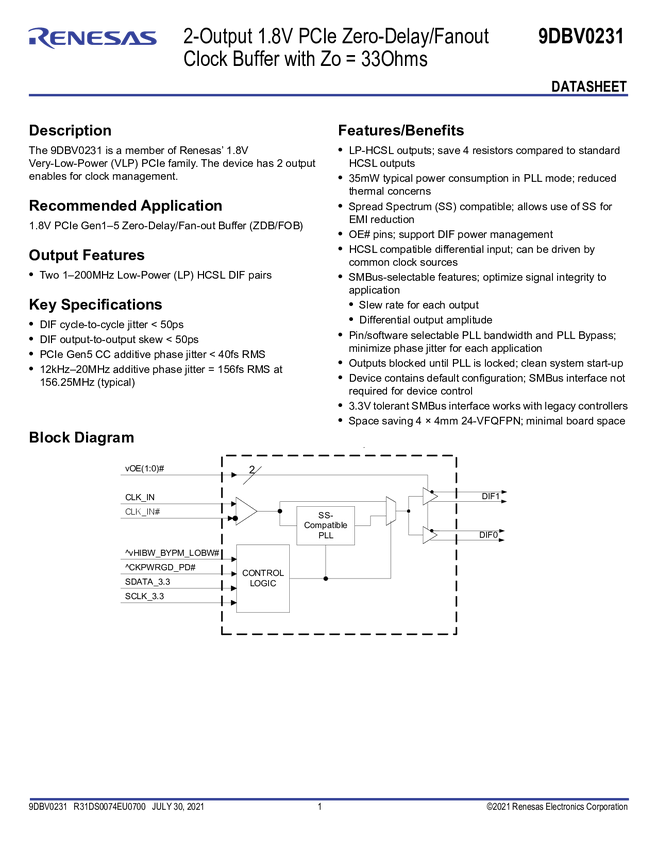 9DBV0231AKILF 2-Output 1.8V PCIe Zero-Delay/Fanout Clock Buffer