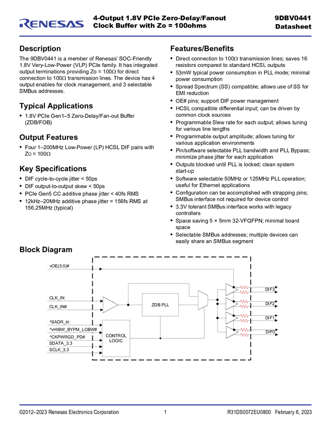 9DBV0441AKILF 4-Output 1.8V PCIe Zero-Delay/Fanout Clock Buffer with Zo=100 ohms