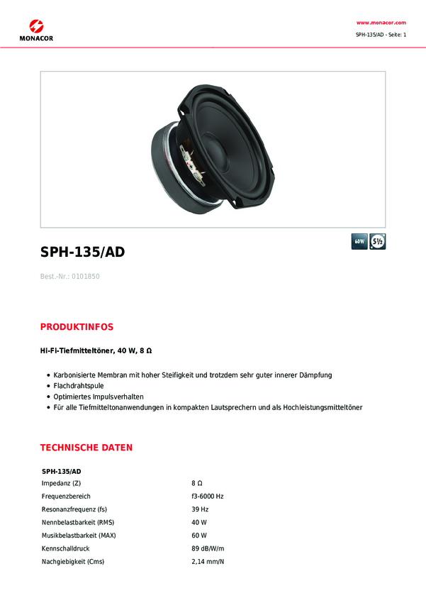 SPH-135/AD Głośnik nisko-średniotonowy Monacor SPH-135/AD