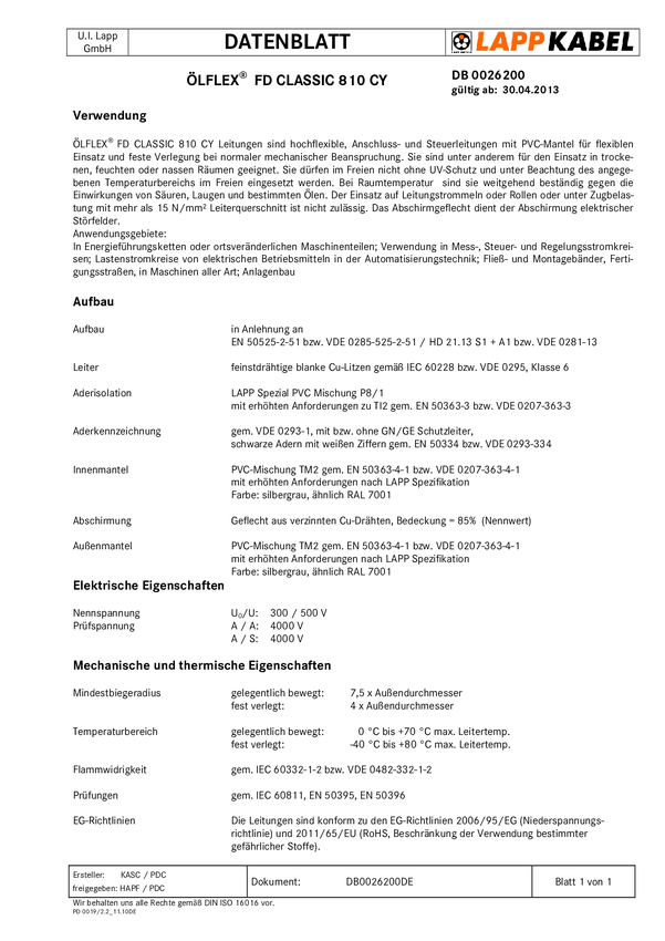 26252/100 Przewód do prowadnicy kabli LAPP ÖLFLEX FD CLASSIC 810 CY 5G1,5 26252/1...