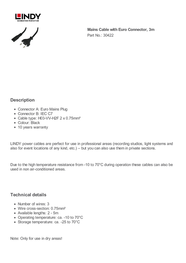 30422 kabel LINDY LINDY 3m Euro Netzstecker an IEC C7 30422, 3.00 m, 1 szt.
