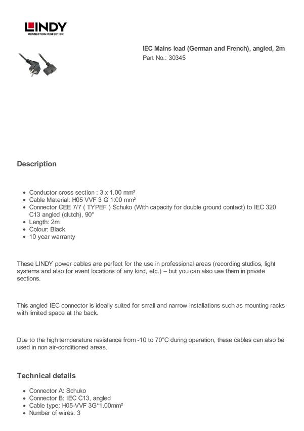 30345 kabel LINDY LINDY 2m abgewinkeltes IEC Netzkabel 30345, 2.00 m, 1 szt.
