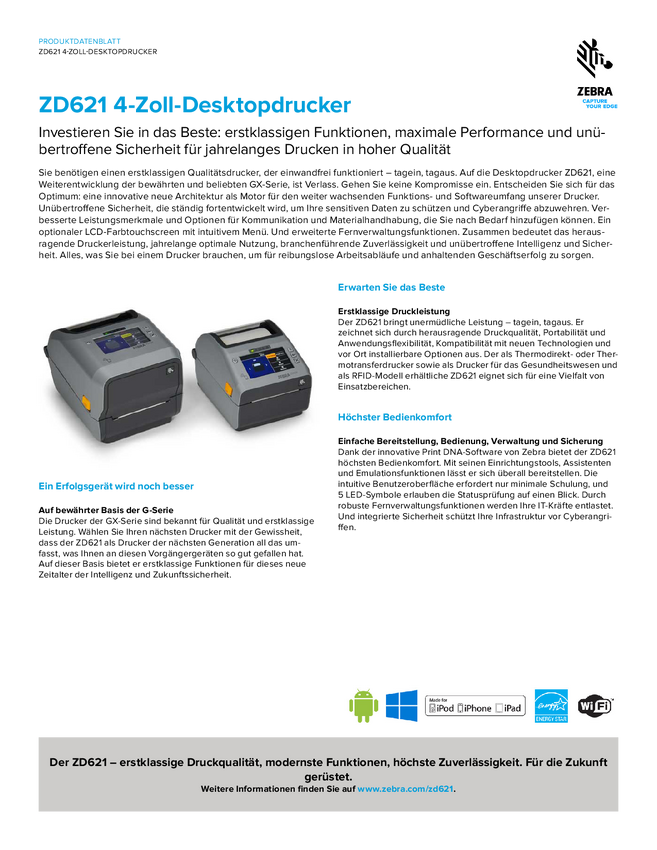 ZD6A042-30EF00EZ Urządzenie do etykietowania Zebra ZD621t 203 x 203 dpi USB, RS-232, LAN, Bl...