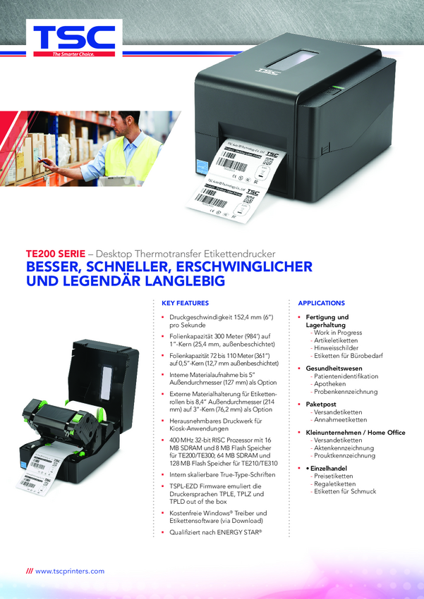 Urządzenie do etykietowania TSC TE210 203 x 203 dpi USB, RS-232, LAN