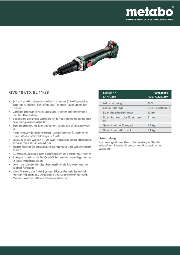 600826850 Szlifierka prosta akumulatorowa Metabo GVB 18 LTX BL 11-28 600826850 1 szt.