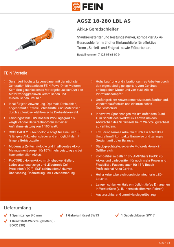 71230561000 Szlifierka prosta akumulatorowa Fein AGSZ 18-280 LBL AS 71230561000 1 szt.