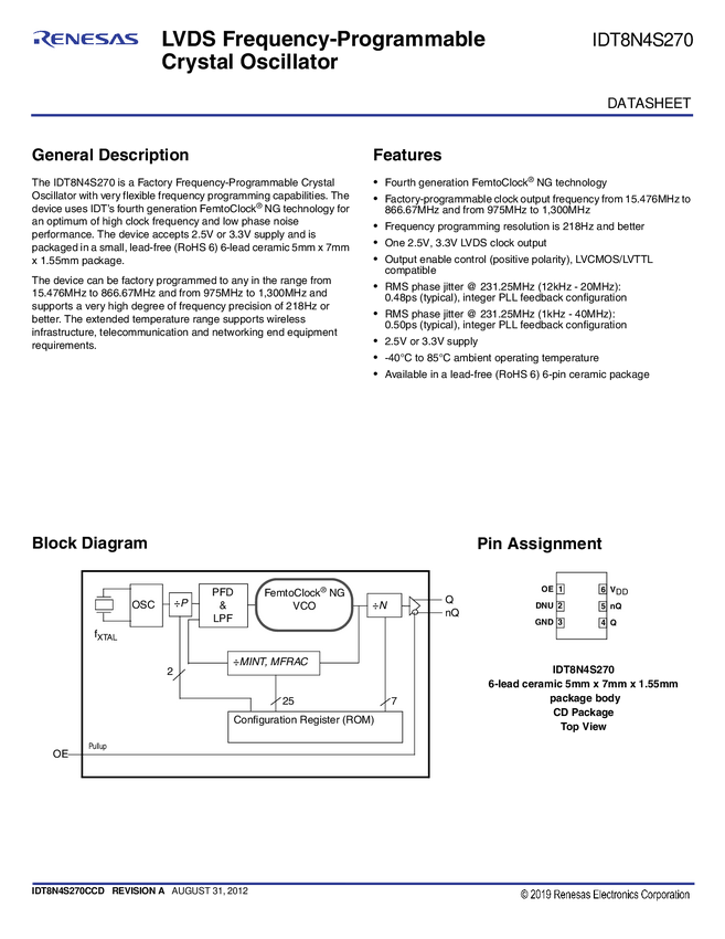 8N4S270LC-1020CDI LVDS Frequency-Programmable Crystal Oscillator