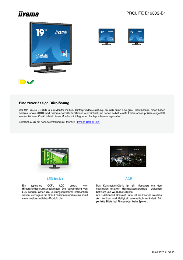 E1980S-B1 Iiyama ProLite E1980S-B1 Monitor EEK D (A - G) 48.3 cm (19 cal) 1280 x 1024...