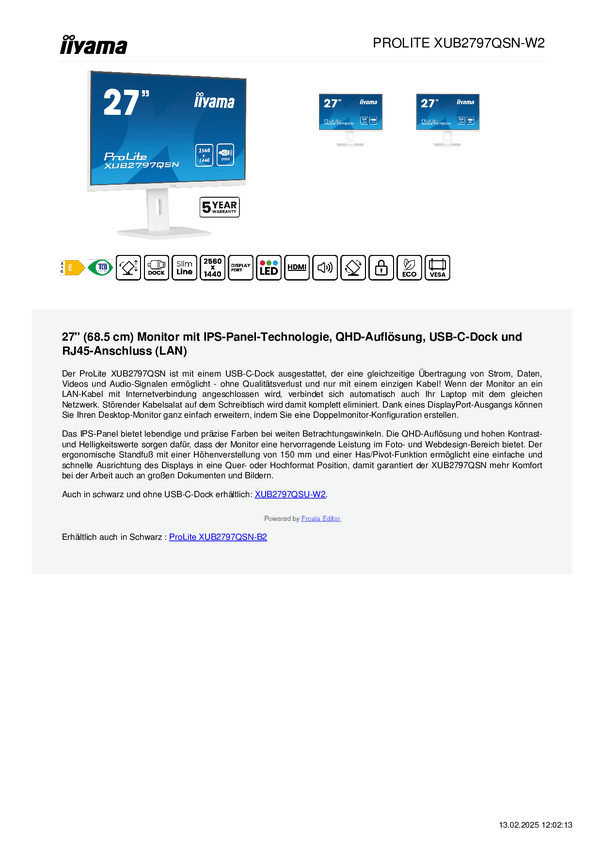 XUB2797QSN-W2 Iiyama ProLite XUB2797QSN-W2 Monitor EEK E (A - G) 68.6 cm (27 cal) 2560 x...