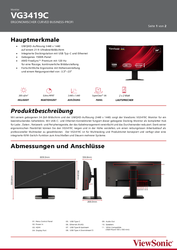 VS19725 Viewsonic VG3419C Monitor EEK G (A - G) 86.4 cm (34 cal) 3440 x 1440 px 16:...