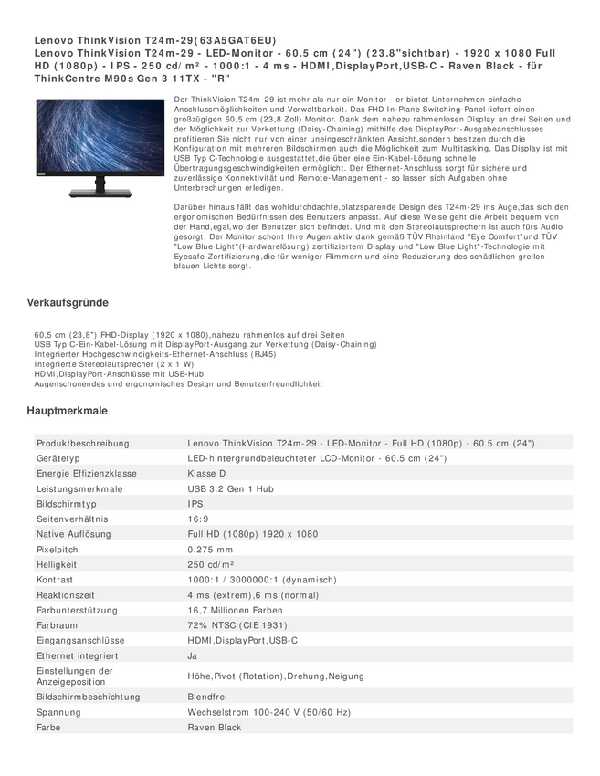 63A5GAT6EU Lenovo ThinkVision T24m-29 Monitor EEK D (A - G) 61 cm (24 cal) 1920 x 1080...