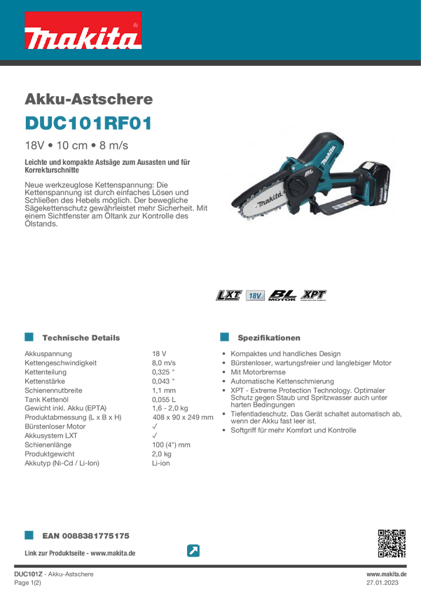 DUC101RF01 Makita akumulatorowy Piła łańcuchowa zaw. akumulator, zaw. ładowarkę Długoś...