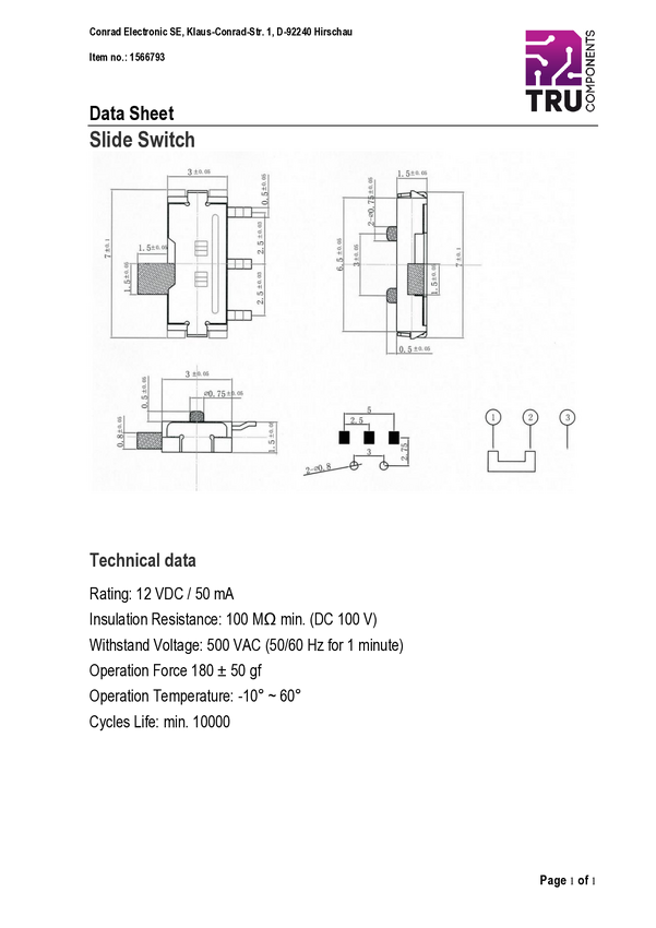 Przełącznik suwakowy 12 V/DC 0.05 A 2 x wyłącz/włącz SSK-1202 1 szt.