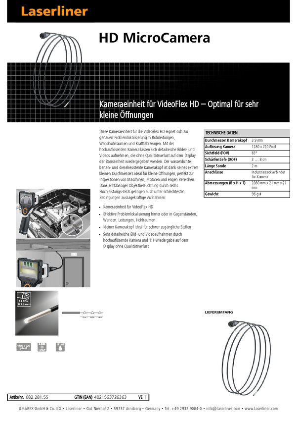 Sonda endoskopu Laserliner HD MicroCamera 082.281.55 Średnica sondy 3.90 mm 2.00 m