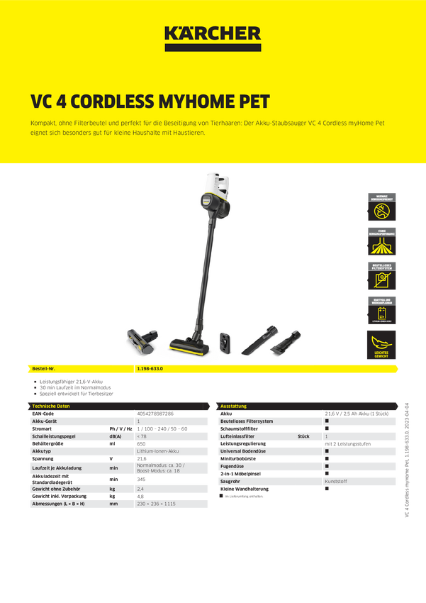 Odkurzacz zasilany akumulatorowo Kärcher Home & Garden VC 4 Cordless myHome Pet 1.198-633.0 0.65 l 1 szt.