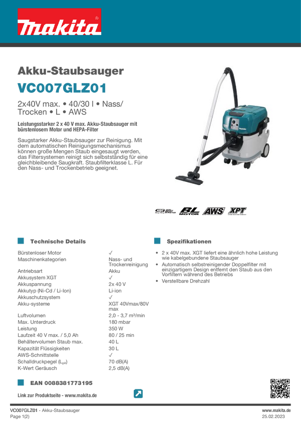 Odkurzacz zasilany akumulatorowo Makita S_0380_8248917 VC007GLZ01 40 l 1 szt.
