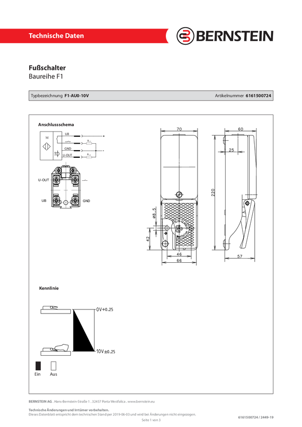 Bernstein 6161500724 Przełącznik nożny F1-AU0-10, 1 pedał, IP65, 1 szt.