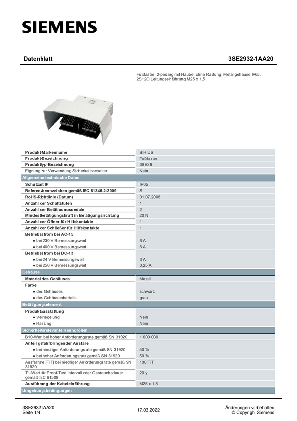 3SE29321AA20 Siemens 3SE29321AA20 Przycisk nożny 3SE2932-1AA20, IP65, 1 szt.