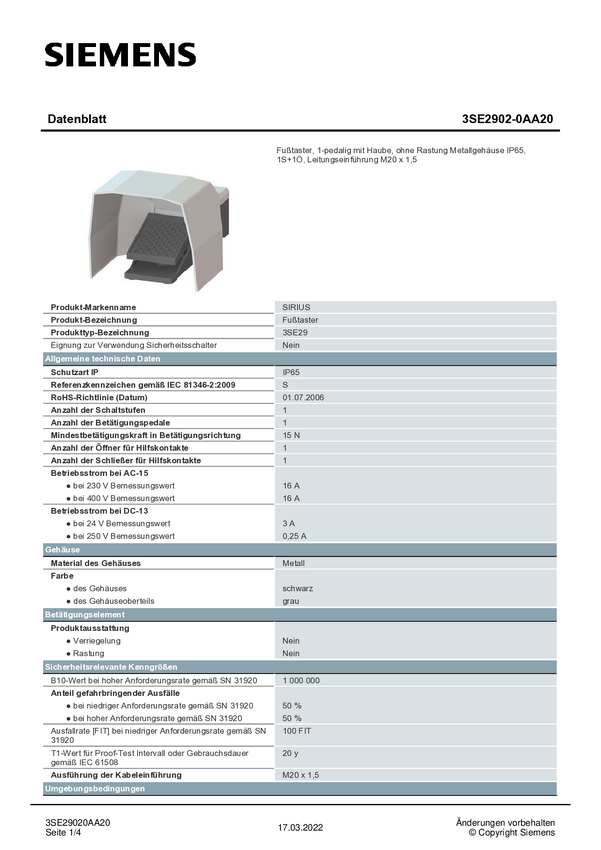 3SE29020AA20 Siemens 3SE29020AA20 Przycisk nożny 3SE2902-0AA20, IP65, 1 szt.