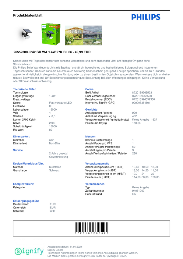 8720169265523 Lampa ścienna solarna Philips LED Jivix 8720169265523 1.4 W 150.00 lm IP44