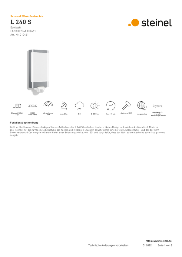 010461 Zewnętrzna lampa ścienna z czujnikiem ruchu Steinel LED AUSSENLEUCHTE L 240...
