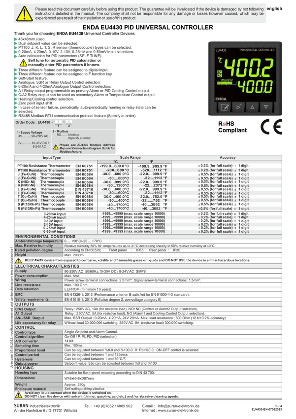 EU4430-230 Regulator uniwersalny Enda EU4430-230 Pt100, J, K, L, T, S, R SSR, Przekaźn...