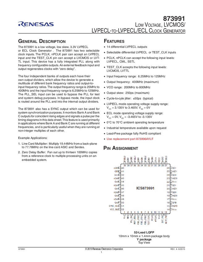 873991AYLFT Low Voltage, LVCMOS/LVPECL-to-LVPECL/ECLClock Generator