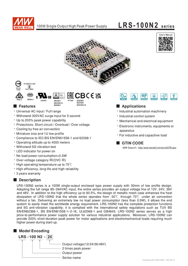 LRS-100N2-48 MEAN WELL LRS-100N2-48 Zasilacz 48 V 2.1 A 100.8 W