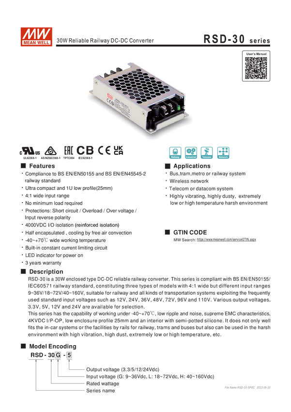 RSD-30H-24 MEAN WELL RSD-30H-24 Przetwornica DC/DC 24 V/DC 30 W