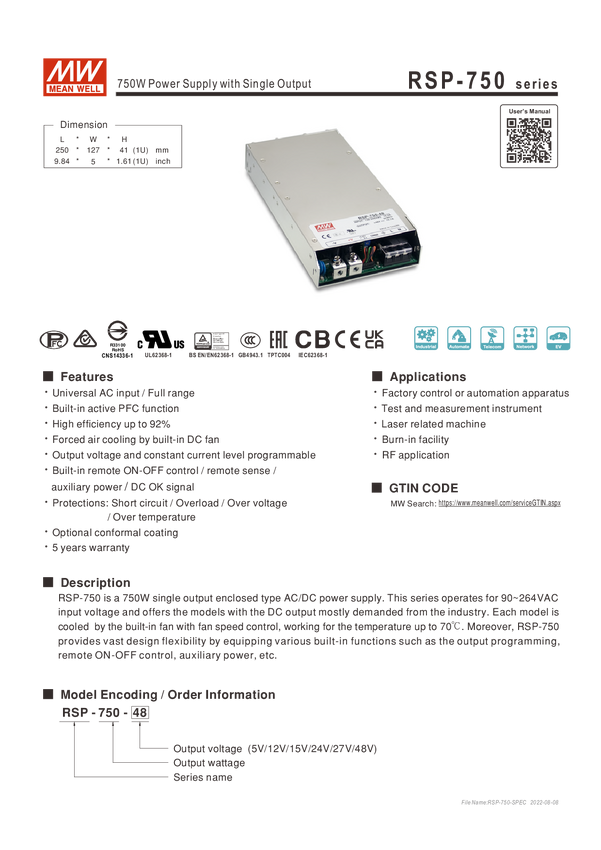 RSP-750-48 Zasilacz MEAN WELL RSP-750-48 48 V/DC 15.7 A 753.6 W