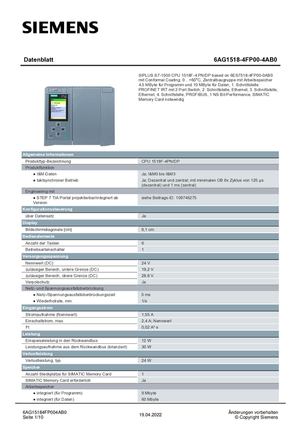 CPU PLC Siemens 6AG1518-4FP00-4AB0 6AG15184FP004AB0