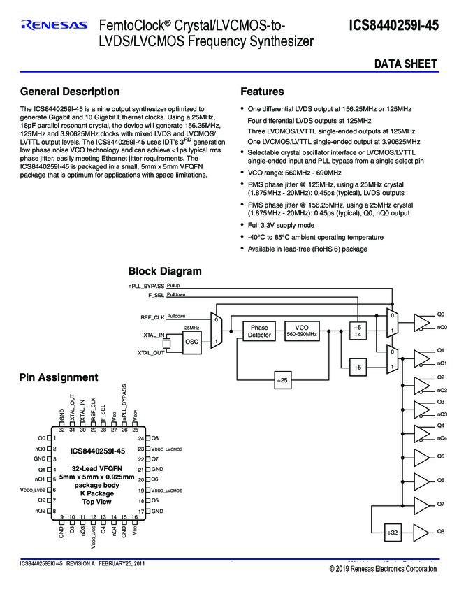 8440259EKI-45LF FemtoClock Crystal/LVCMOS-to-LVDS/LVCMOS Frequency Synthesizer