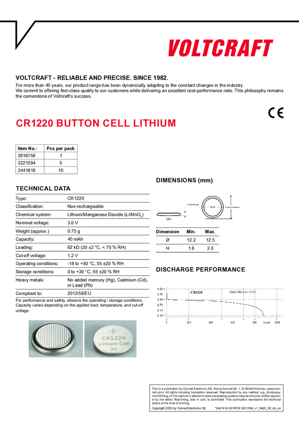 VC-13083780 Ogniwo guzikowe CR 1220 VOLTCRAFT LM1220 3 V 1 szt. 40 mAh litowe
