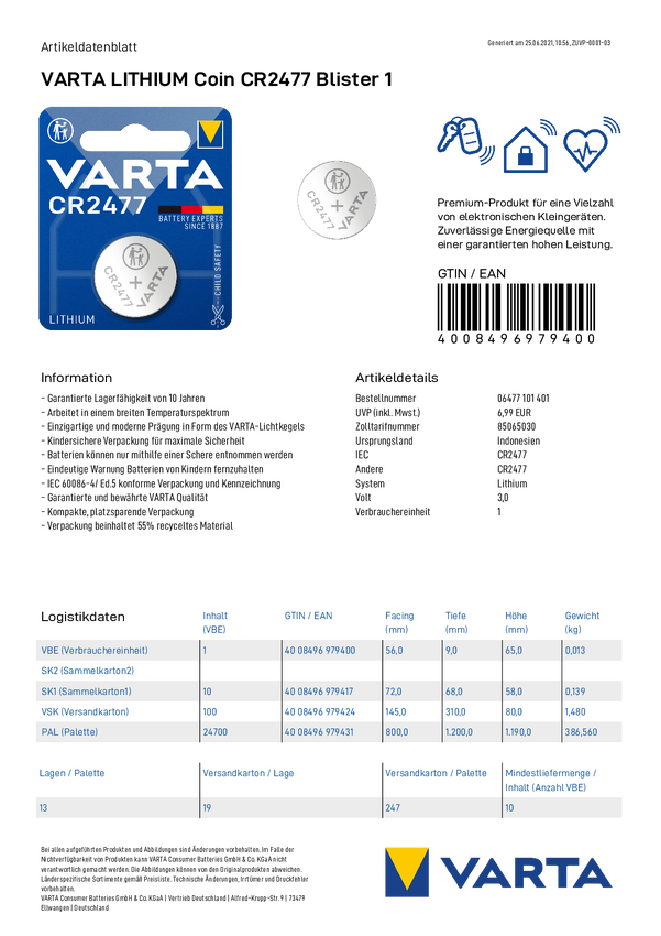 6477101401 Ogniwo guzikowe CR 2477 Varta LITHIUM Coin CR2477 Bli 1 3 V 1 szt. 850 mAh...