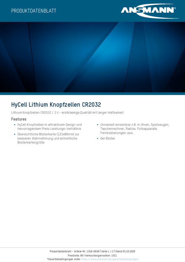 1516-0026 Ogniwo guzikowe CR 2032 HyCell CR2032 3 V 6 szt. 200 mAh litowe