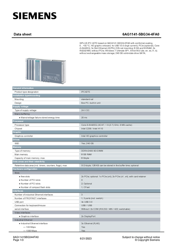 6AG11415BG344FA0 Siemens Komputer przemysłowy PC 6AG1141-5BG34-4FA0 6AG11415BG344FA0