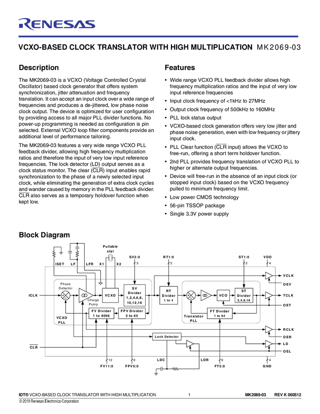 MK2069-03GI VCXO-Based Clock Translator With High Multiplication