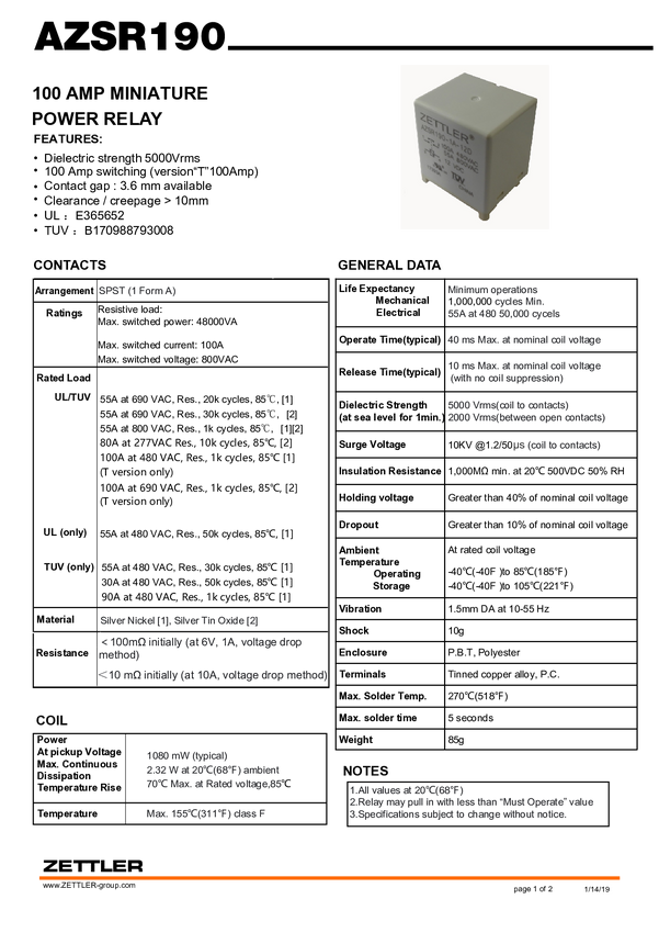 AZSR190T-1AE-12D Zettler Electronics AZSR190T-1AE-12D Przekaźnik mocy 12 V/DC 100 A 1 NO...