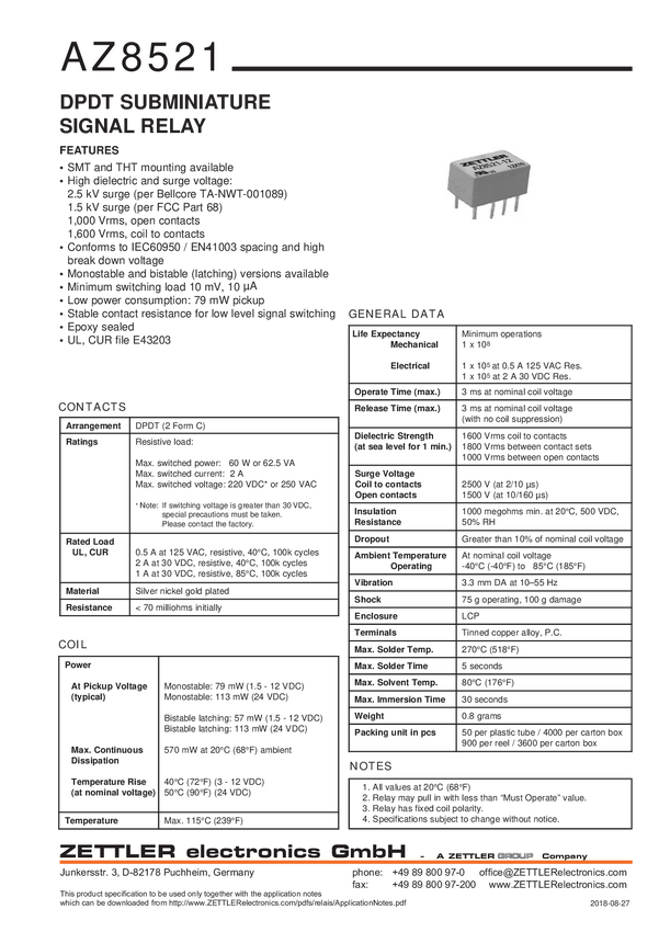 AZ8521-12 Zettler Electronics AZ8521-12 Przekaźnik SMT 12 V/DC 2 A 2 zestyki prze...