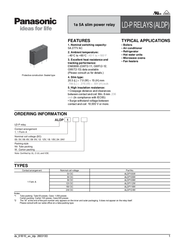 ALDP105 Panasonic ALDP105 Przekaźnik SMT 5 V/DC 5 A 1 NO 1 szt.
